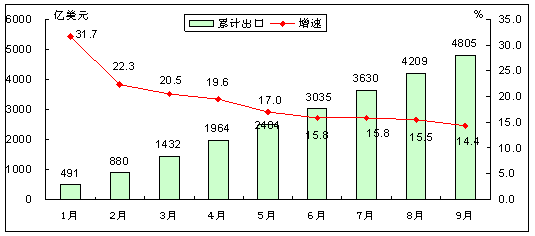 外資企業(yè)出口相對(duì)緩慢。1-9月,外商獨(dú)資企業(yè)出口3090億美元,增長(zhǎng)13.9%,增速低于平均水平0.5個(gè)百分點(diǎn);中外合資企業(yè)出口755億美元,增長(zhǎng)7.9%,增速低于平均水平6.5個(gè)百分點(diǎn);中外合作企業(yè)出口45億美元,增長(zhǎng)13.4%,增速低于平均水平1.0個(gè)百分點(diǎn)。