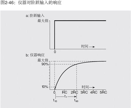 模擬儀器(或模擬輸出)的上升時間一般定義為輸入信號從零立即上升到某一固定值時,輸出信號從最終值的10%上升到90%所需要的時間。此關系示于圖2-46。圖2-46a示出假定上升時間為零的階躍函數(shù),而圖2-46b示出儀器的響應及相應的上升時間。單極點系統(tǒng)(1階系統(tǒng))的上升時間、頻率響應和RC常數(shù)是有關聯(lián)的。3dB點由下式給出: