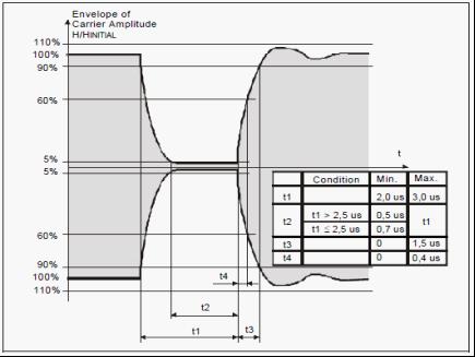 13.56MHz高頻RFID系統(tǒng)是目前國內(nèi)應用最為廣泛,技術(shù)較為成熟的射頻識別系統(tǒng)。相關(guān)的國際標準對射頻發(fā)射頻率、信道帶寬、發(fā)射功率等參數(shù)都有明確的要求,特別是RF信號的幅度(功率)隨時間變化的情況,標準有著嚴格的規(guī)定。以讀寫設備為例,讀寫設備發(fā)出的載波信號的幅度變化時間,必須符合ISO18000-3標準對于t1-t4的時間限制。