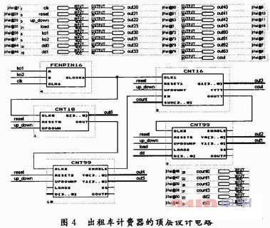 頂層設(shè)計(jì)采用原理圖輸入方式。通過調(diào)用生成的各模塊符號(hào),并將它們作適當(dāng)連接以實(shí)現(xiàn)頂層文件的設(shè)計(jì)。出租車計(jì)費(fèi)器的頂層設(shè)計(jì)電路,如圖4所示。