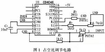 圖l為占空比調(diào)節(jié)電路。該電路是將調(diào)節(jié)器輸出的電壓信號作為壓控振蕩器VCO(Voltage CONtrolled Oscillator)的輸入信號,此信號是一個在0~5 V之間變化的直流電壓信號,即INPUT信號,由于VCO是一個電流控制振蕩器,對定時電容C1的充電電流與從引腳9輸入的控制電壓成正比,使VCO的振蕩頻率正比于該控制電壓。當(dāng)VCO控制電壓為0 V時,其輸出頻率最低;當(dāng)輸入控制電壓等于電源電壓VDD時,輸出頻率則線性增大到最高輸出頻率。VCO振蕩頻率的范圍由R1、R2和C1決定。VCO振蕩頻率由CD4046的引腳4直接輸出到CPLD處理單元,CPLD內(nèi)部通過對該脈沖信號的計數(shù)來控制逆變觸發(fā)脈沖的寬度,來調(diào)節(jié)觸發(fā)脈沖的占空比。