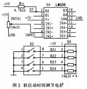 圖2為軟啟動時間調(diào)節(jié)電路。該電路單元是將調(diào)節(jié)器輸出信號作為電壓比較器LM339的輸入信號,此信號是一個在0~5 V之間變化的直流電壓信號(即INPUT信號)。按照設(shè)計要求,LM339的引腳6給定電壓為1 V,當(dāng)INPUT信號的電壓大于l V時,LM339的引腳l通過上拉電阻輸出一個高電平作為啟動信號送入CPLD。在CPLD內(nèi)部通過調(diào)節(jié)外部的撥段開關(guān)控制比較器的輸出,從而控制軟啟動的時間。