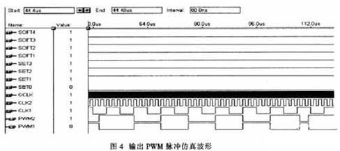 該系統(tǒng)軟件設(shè)計是根據(jù)系統(tǒng)功能要求而設(shè)計的,基于EPM7128的軟件程序設(shè)計分為:輸出脈沖占空比調(diào)節(jié)、頻率調(diào)節(jié)、軟啟動時間調(diào)節(jié)和過壓過流報警。開發(fā)系統(tǒng)使用VHDL語言進(jìn)行模塊化編程,這樣可以提高程序的移植性,縮短開發(fā)周期,降低開發(fā)成本。而且易于維護(hù)系統(tǒng)軟件,提高可靠性。圖4是輸出的兩路PWM脈沖仿真波形,其中GCLK是一個基準(zhǔn)時鐘源,CLKl和CLK2分別是經(jīng)VCO轉(zhuǎn)換的頻率調(diào)節(jié)和占空比調(diào)節(jié)信號,SET和SOFT分別是2個外接的4位占空比調(diào)節(jié)和軟啟動調(diào)節(jié)撥段開關(guān)。