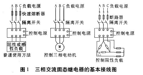 單相SSR為四端有源器件,其中兩個輸入控制端,兩個輸出端,輸入輸出間為光隔離,輸入端加上直流或脈沖信號到一定電流值后,輸出端就能從斷態(tài)轉(zhuǎn)變成通態(tài)。而三相交流固態(tài)繼電器則是集三只單相交流固態(tài)繼電器為一體,并以單一輸入端對三相負(fù)載進(jìn)行直接開關(guān)切換,可方便地控制l一相交流電機(jī)、加熱器等三相負(fù)載,圖1為三相交流固態(tài)繼電器的基本接線圖。三相交流固態(tài)繼電器的相與相問,輸入輸出間,以及與基板之間絕緣電壓大于2 000 VAC,其他基本指標(biāo)與相應(yīng)的單相固態(tài)繼電器相同。需要指出的是對實際負(fù)載電流不大的場合,比如實驗室教學(xué),三相SSR使用起來比較方便,但電流大時發(fā)熱亦大,這時使用三只單相SSR更為可靠。
