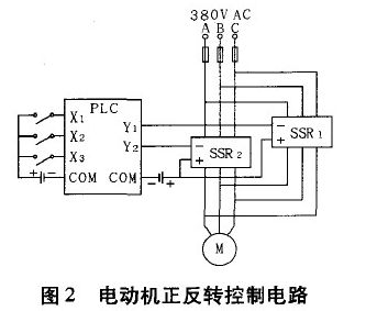 圖2為PLC控制的三相交流電動機(jī)正反轉(zhuǎn)控制電路,其中X1、X2、X3,分別表示PLC的輸入,控制電動機(jī)的轉(zhuǎn)動方向與起停;Y1、Y1表示PLC的輸出。當(dāng)Y1有效時,SSR1輸入端得到DC24V的直流信號,則三相輸出端從斷態(tài)轉(zhuǎn)變成通態(tài),三相交流電動機(jī)得電,反轉(zhuǎn);同理當(dāng)Y 有效時,SSR2的三相輸出端接通,因A、c換向則電動機(jī)正轉(zhuǎn)。