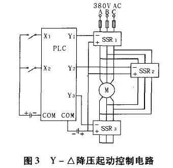 圖3為PLC控制的Y-△降壓起動控制電路,其中X1、X2分別表示PLC的輸入,控制電動機(jī)的起停;Y1、Y2、Y3表示PLC的輸出。當(dāng)Y1和Y3有效時,對應(yīng)的SSR1和SSR3也同時有效,此時電動機(jī)為Y型接法,延時幾秒后,Y3失效,Y2有效,則對應(yīng)的SSR3三相輸出端斷開,SSR2三相輸出端合上,則電動機(jī)變?yōu)椤鹘臃ǎ瓿闪薡一△降壓起動。