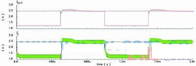 為了說明這個(gè)方案,圖1中的降壓轉(zhuǎn)換器會(huì)采用這些配置:L=20mH、COUT=47mF、RL值在2.64W(正常模式)~1.1W(電流限制模式)間轉(zhuǎn)換,并會(huì)使用一個(gè)tD=100ns的比較器,而IOUT(CL,DES)和IL(RIPPLE)分別是2.5A和0.3A。不過,如果使用傳統(tǒng)的峰值電流限制方法,那么式(1)中的IV便會(huì)設(shè)定為2.35A,傳統(tǒng)方法的模擬結(jié)果如圖4所示。由此可以看到,IOUT(CL)會(huì)由于tD的影響而低于2.5A。然而,使用新方法并將ILR設(shè)定在2.5A,IOUT(CL)便可如圖5所示達(dá)到2.5A。于是,傳統(tǒng)方法中出現(xiàn)的問題便能夠在該方案中解決。