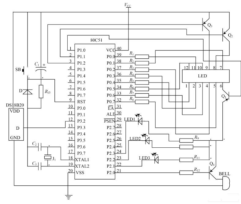 包括信號采集、系統(tǒng)控制、數(shù)字顯示、高溫報警四個部分。傳感器DS18B20 為信號采集器件所采集到的溫度信號,通過內(nèi)部處理由傳感器的DQ 端送到單片機P3. 2 端口,經(jīng)單片機的計算處理后,由P0 口和P1 口分別作為4 位共陽數(shù)碼管的段控信號和位控信號,共同完成對所測溫度值的數(shù)字顯示,最高位是符號顯示,如顯示負(fù)號“-”時,表示當(dāng)前溫度是負(fù)溫度,否則為正溫度;由P2. 0 端口控制蜂鳴器,當(dāng)測量的溫度超過“預(yù)設(shè)報警溫度”時,發(fā)出提示音報警; P2. 1~ P2. 3 端口來控制黃、綠、紅3 個發(fā)光二極管分別表示低溫、正常、高溫三種溫度狀態(tài)。石英晶體JT 和電容C2 ,C3 共同組成晶振電路; 電容C1 、電阻R 13、S B 共同構(gòu)成復(fù)位電路; 其中電阻R13為下拉電阻,SB 為手動復(fù)位按鈕。