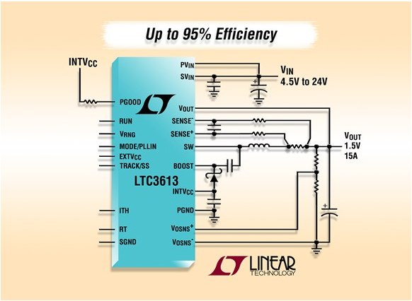 凌力爾特公司 (Linear Technology Corporation) 推出高頻、接通時間受控的同步降壓型 DC/DC 轉(zhuǎn)換器 LTC3613,該器件具差分輸出電壓采樣和時鐘同步。受控的接通時間和谷值電流模式架構(gòu)在瞬態(tài)事件時可通過提高工作頻率以實現(xiàn)非??焖俚乃矐B(tài)響應,從而允許 LTC3613 僅在幾個時鐘周期內(nèi)就可從大的負載步進中恢復。其 4.5V 至 24V 的輸入范圍支持多種應用,其中包括大多數(shù)中間總線電壓。集成的 N 溝道 MOSFET 可在 0.6V 至 5.5V 的輸出電壓范圍內(nèi)提供高達 15A 的連續(xù)負載電流,從而使該器件非常適用于負載點應用。