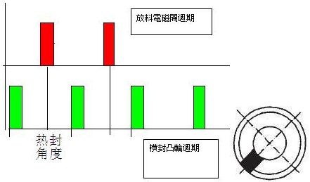 根據(jù)熱封的電子凸輪周期0~360設(shè)定促發(fā)開啟放料閥即可。比如,在開機(jī)前假設(shè)設(shè)定50度,放料。實(shí)際出現(xiàn)夾料。調(diào)整促發(fā)角度到150,直到合適為止。因?yàn)槁淞蠒r(shí)間足夠短,一個(gè)周期按120袋來算也有500ms。
