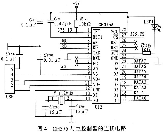 為便于儀器現(xiàn)場使用方便,該系統(tǒng)設(shè)計了對外信息輸送的USB接口,可使儀器便捷地與各類存儲器及電腦連接。其中,USB接口控制器采用CH357器件。CH357支持USB-HOST主機方式和USBDEVICE/SLAVE設(shè)備方式。在本地端CH375具有8位數(shù)據(jù)總線和讀、寫、片選控制線以及中斷輸出,可方便地掛接到ATxmegal28Al微控制器的系統(tǒng)總線上。圖4為CH375與主控制器的連接電路,CH375的TXD引腳直接接地,從而使CH375工作于并口方式。電容C1201用于CH375內(nèi)部電源節(jié)點退耦,采用0.01μF的高頻瓷片電容,可提高接口的EMI要求。電容C47和C1202用于外部電源退耦,采用0.1μF的高頻瓷片電容。晶體X11、電容C1203和C1204用于CH375的時鐘振蕩電路。USB-HOST主機方式要求時鐘頻率比較準(zhǔn)確,X11的頻率是12 MHz±0.4‰,C1203和C1204是容量約為15 pF的獨石電容。LEDl為數(shù)據(jù)傳送指示燈,用戶可以直觀觀察數(shù)據(jù)傳送狀態(tài)。