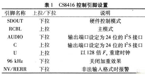 CS8416是數(shù)字音頻信號接收電路的核心。在軟件控制方式下,MCU通過SPI或I2C接口沒置參數(shù)。該方式還可靈活更改內(nèi)部配置。在無MCU時則通過硬件控制方式改變其特定引腳電平實現(xiàn)控制。由于本系統(tǒng)中無MCU,因此采用硬件控制方式。在SDOUT引腳上用一只47kΩ電阻下拉至地即可,且引腳AUDIO、RCBL、U、C等不能懸空,必須通過一只47kΩ電阻上拉至高電平或下拉至低電平,以便系統(tǒng)復(fù)位后,CS8416通過檢測這些引腳電平?jīng)Q定其工作狀態(tài)。表1為該系統(tǒng)設(shè)計的控制引腳的配置。