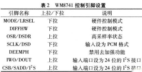 WM874l的I2S輸入接口與CS8416的輸出連接時中間加入100Ω電阻進(jìn)行緩沖,如圖2所示。WM874l設(shè)定硬件控制模式,即通過特定引腳的上拉或下拉狀態(tài)決定其工作狀態(tài),且所有上拉或下拉的電阻均為10kΩ。該系統(tǒng)設(shè)計的WM8741控制引腳設(shè)置如表2所示。