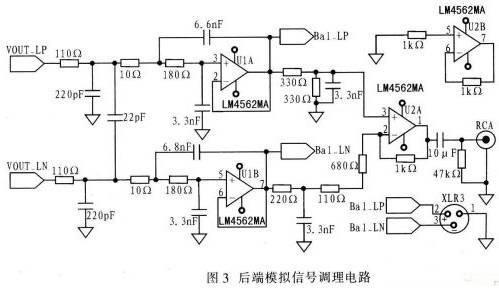 WM8741輸出的模擬信號中夾雜高次諧波分量,因此需經(jīng)低通濾波濾除高頻噪聲,進(jìn)而得到較為純凈的模擬信號。濾波電路采用LM4562型運算放大器。對于數(shù)模轉(zhuǎn)換電路,在D/A轉(zhuǎn)換器的后面需采用3階濾波器才能達(dá)到防混疊要求。由LM4562外加電阻電容組成的三階巴特沃斯低通濾波器,如圖3所示。濾波器是單位增益,通頻帶內(nèi)平坦度好。經(jīng)濾波后的信號可直接作為解碼器的平衡信號輸出。當(dāng)以RCA接口輸出時,還需把差分信號轉(zhuǎn)換為單端信號,該轉(zhuǎn)換電路是由一片LM4562組成的差動放大電路。單端信號經(jīng)一只10μF的隔直電容輸出到RCA接口。LM4562采用單獨的±12V電源供電。