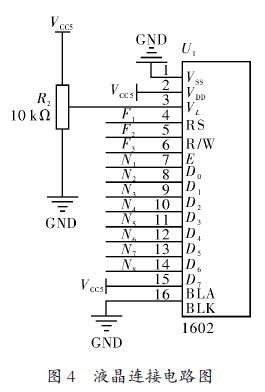 圖2中VCC5是電源電壓,經(jīng)過LM1117芯片輸出為3.3 V,為INA126(儀表放大器)、ADS7816和ICL7660供電。經(jīng)過TL431輸出2.490 V的電壓,為橋式放大電路和ADS7816提供穩(wěn)定的基準(zhǔn)電壓。ICL7660把+3.3 V轉(zhuǎn)換為-3.3 V,為儀表放大器提供負(fù)電壓。因?yàn)閱纹瑱C(jī)和液晶顯示器的工作電壓范圍廣,所以VCC直接和總電源相連。