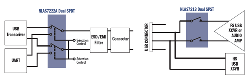 安森美半導(dǎo)體的USB開(kāi)關(guān)器件包括NLAS7242、NLAS4717EP、NLAS7213、NCN9252和NLAS8252等,主要功能是處理USB 2.0高速信號(hào),具有3.0 V電壓時(shí)6.5Ω的典型導(dǎo)通阻抗、500 MHz帶寬,以及低串?dāng)_(250 MHz時(shí)為-45 dB),采用業(yè)界最小封裝。圖2是NLAS7222A雙SPDT和NLAS7213雙SPST框圖。