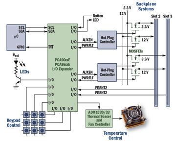 安森美半導(dǎo)體的級(jí)聯(lián)I/O擴(kuò)展器采用I2C和SMBus接口和1 MHz的SCL時(shí)鐘頻率,具有30 mA SDA灌電流能力,可用于背板系統(tǒng)等應(yīng)用,實(shí)現(xiàn)鍵盤(pán)控制、溫度控制、熱插拔控制等功能。圖6是背板系統(tǒng)的各種控制功能。