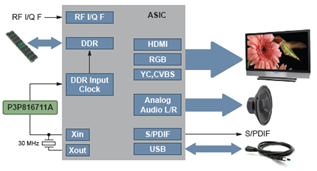 在機(jī)頂盒的DDR存儲(chǔ)器EMI抑制應(yīng)用中,使用P3P816711A可降低1倍LVCMOS峰值EMI,可30 MHz的輸入?yún)⒖紩r(shí)鐘,并提供30 MHz ± 0.3%輸出時(shí)鐘。