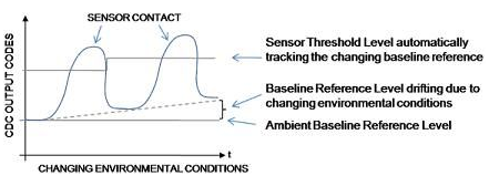 保持可靠性能。容性傳感器電極是采用PCB上的標準銅材料或柔性材料制成的。這種材料的特性會隨溫度和濕度的變化而發(fā)生改變。這種變化會使基線電平發(fā)生偏移(所有傳感器閾值電平均是以基線電平為參考的)。較大的基線偏移增加了接觸閾值電平過低或過高的風險(過低還是過高取決于基線偏移的方向)這會引起虛假的接觸誤差,或使閾值電平不是太靈敏就是不夠靈敏,導致接觸狀態(tài)的不穩(wěn)定。為保持傳感器原始的信號接觸閾值檢測電平余量(靈敏度),CDC需要自動跟蹤基線偏移誤差的幅度,并對閾值設置進行相應的重新調(diào)整。圖2中的示例介紹了AD7147和AD7148的閾值電平如何針對因環(huán)境條件變化引起的基線失調(diào)變化進行自動跟蹤和調(diào)整。