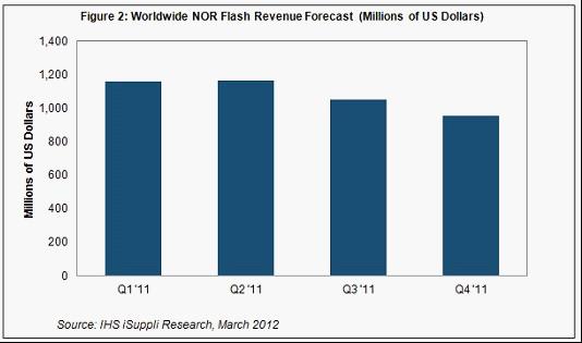 據(jù)IHS iSuppli公司的移動(dòng)市場(chǎng)存儲(chǔ)報(bào)告,由于經(jīng)濟(jì)形勢(shì)糟糕和泰國洪災(zāi)導(dǎo)致PC出貨量下降,2011年第四季度NOR閃存營業(yè)收入環(huán)比下降9%。