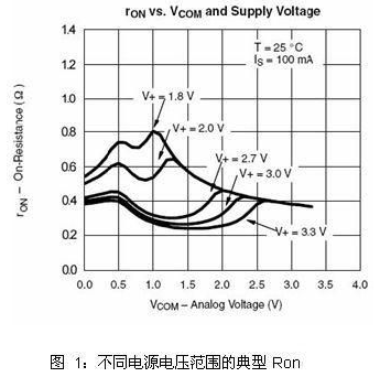 低導(dǎo)通電阻往往是模擬開關(guān)在音頻切換時(shí)的主要選擇因素。值得注意的是,導(dǎo)通電阻是針對(duì)具體的VCC、VIN(電壓輸入)及給定負(fù)載電流而指定的。在晶體管級(jí),RON為器件長度(L)、器件寬度(W)、電子與空穴遷移率、氧化層電容、門限電壓及信號(hào)電壓的函數(shù)?! ?br />