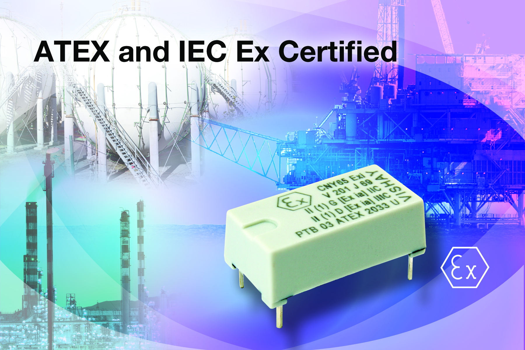 CNY65Exi獲得了ATEX證書(shū)PTB 03 ATEX 2033 U,器件具有最高水平的11600V隔離電壓,CTI值達(dá)475滿(mǎn)足VDE 0303/DIN 53480的要求。器件滿(mǎn)足ATEX對(duì)氣體[II (1) G (Ex ia) IIC]和灰塵[II (1) D (Ex ia) IIIC]的各項(xiàng)規(guī)定。