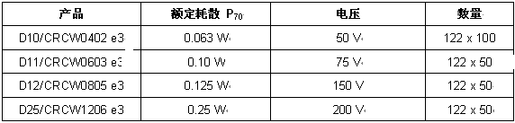 本次發(fā)布的4款設(shè)計(jì)套件采用E96系列阻值標(biāo)準(zhǔn),范圍從10Ω到1MΩ(每檔間隔4個(gè)阻值),同時(shí)額外包含一個(gè)0Ω跳線,每款套件總共包含122種不同的阻值。電阻的容差為±1%,TCR為±100ppm/K,功率耗散為0.063W~0.25W,電阻芯電壓為50V~200V。