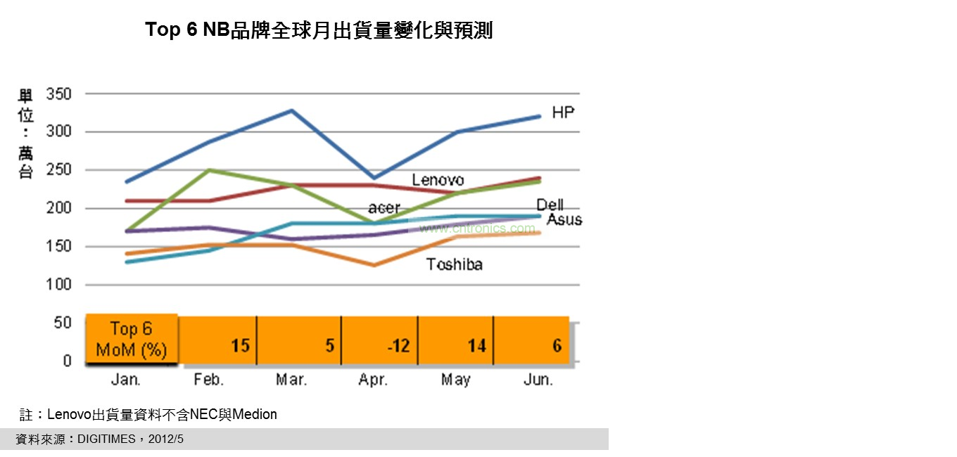 DIGITIMES Research資深分析師兼主任簡(jiǎn)佩萍分析,品牌與代工廠NB月出貨量方面,在歷經(jīng)低迷的4月后,5月搭配英特爾(Intel)新品NB鋪貨效應(yīng),出現(xiàn)兩位數(shù)的月成長(zhǎng)幅度;但整體而言仍較先前預(yù)測(cè)的出貨成長(zhǎng)緩和許多,尤其對(duì)6月份的出貨展望,全球前6大品牌普遍保守,預(yù)期前6大品牌月NB出貨量成長(zhǎng)幅度也將因此驟降至個(gè)位數(shù)。