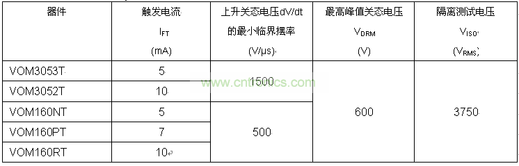 VOM3052T和VOM3053T具有高達(dá)1500V/μs的靜態(tài)dV/dt,尤其適用于噪聲環(huán)境。在這些地方,即使在輸入端沒有任何觸發(fā)信號,由于在輸出負(fù)載上存在高擺率瞬態(tài),較低的dV/dt可能引起晶閘管觸發(fā)。