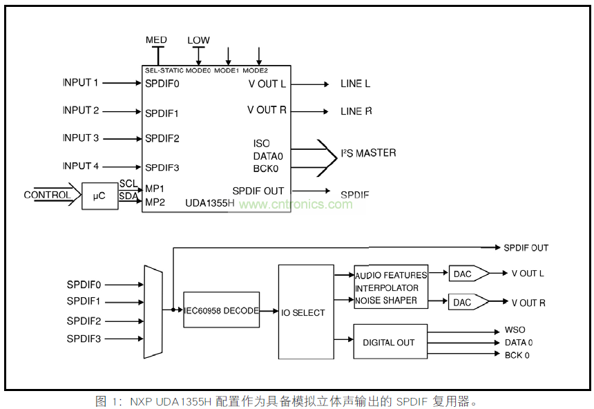 圖 1 顯示了配置為 1/4 SPDIF 的多路復用器,有模擬立體聲輸出的 NXP UDA1355H。請注意,復用器中選擇的SPDIF 信號也可以傳輸?shù)?SPDIF 輸出,使組件可以使用菊花鏈,保持數(shù)字域音頻,維持音頻質(zhì)量。因此,可以很容易地實現(xiàn) 1/(3n+1)多路復用器,其中第 n 個DAC,I2S 或 SPDIF 作為主復用輸出。如果這是所需要的全部,通過簡單將 SEL_STATIC引腳設(shè)置為高( 靜態(tài)模式),而不是中(I2C 模式),僅使用 UDA1355H無須微控制器就可以實現(xiàn)。