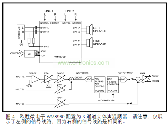 其它功能包括主音量,自動音量控制,環(huán)繞立體聲和低音增強。SGTL5000 還提供了一個集成的耳機放大器。第三個設(shè)備,來自歐勝微電子的 WM8960,是目前編解碼器中高水平集成技術(shù)的代表。此部分顯示在圖 4 中,已配置為立體聲麥克風和兩個立體聲線路級源的立體聲混頻器,帶有直接(D 類)揚聲器驅(qū)動器。它還包括一個片載耳機驅(qū)動器,連接 16Ω 負載,功率可達 40mW。