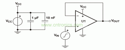 為了更好地理解超出VICMR帶來(lái)的影響,我們列舉出了一些此類(lèi)違規(guī)的例子。我們選擇兩個(gè)不同VICMR規(guī)范的運(yùn)算放大器,以說(shuō)明這些影響。我們之所以選擇這些器件,是因?yàn)樗鼈兙哂熊壍杰壿敵?,可排除輸出?jí)帶來(lái)的一些限制。圖3所示單電源電壓跟隨器電路,用于獲取兩個(gè)器件的波形。所有數(shù)據(jù)均在~25°C室溫下的實(shí)驗(yàn)臺(tái)獲取。