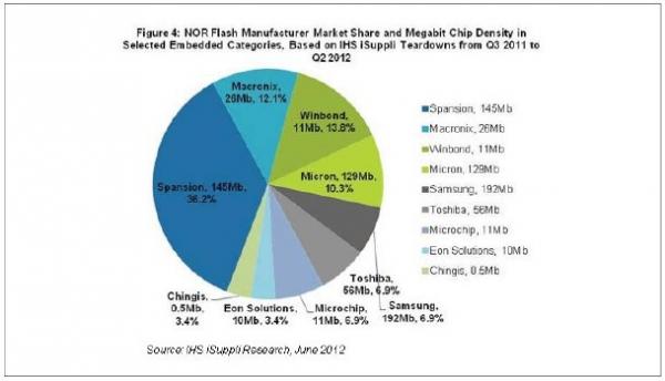 根據IHS iSuppli公司在三個季度內拆解分析的55個嵌入產品,這些產品中有三分之一以上的NOR芯片屬于美國Spansion Inc.,在所有供應商中處于領先地位,如圖所示。Spansion,以及韓國三星電子和美國美光,提供的NOR芯片平均密度為數百Mb。從2011年第三季度到今年第二季度,這三家公司占上述三個子領域中NOR芯片的53.4%。剩下的46.6%市場份額屬于生產100Mb以下密度NOR閃存的廠商。這類廠商包括臺灣旺宏電子和華邦電子等大型廠商,以及臺灣常憶科技和宜揚科技等規(guī)模較小的廠商。