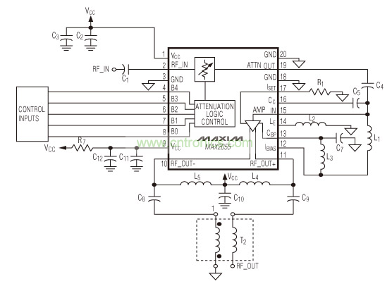 Maxim的MAX2055、MAX2027可用作MAX12559的緩沖放大器,MAX2055是一個(gè)帶寬在30~300MHz的數(shù)控可變增益放大器(圖2)。