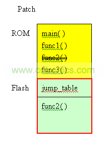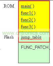 在上圖中,黃色區(qū)域是IC的ROM,這部份的程序是IC制作出來即不可以改變。綠色部份是flash。在圖中,flash分成2區(qū),一個是jump_table,存放func1~func3的地址。剩余的空間FUNC_PATCH,預留給patch使用。