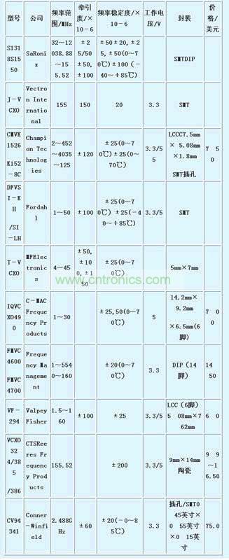 隨著現(xiàn)代無線通信系統(tǒng)向高頻、寬帶、便攜式方向發(fā)展,要求VCXO具有高頻、高性能、頻率范圍寬、線性度好、頻率穩(wěn)定度優(yōu)、頻率牽引誤差小、噪聲低和封裝尺寸小等特性。世界上各先進國家競相開發(fā)與生產(chǎn)高水平的產(chǎn)品來滿足日益增長的市場需求。表1為美國十大著名VCXO廠商生產(chǎn)的VCXO品種、性能和價格1。