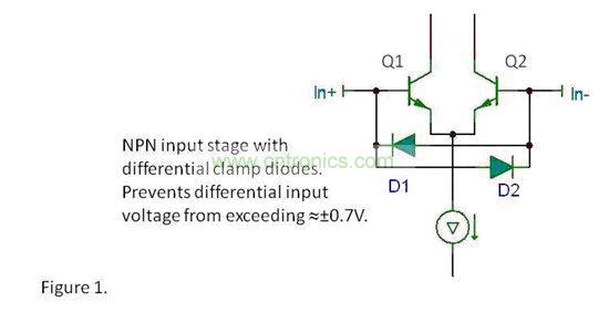 許多運算放大器都在輸入端之間有電壓鉗位,其大多數(shù)一般都使用背靠背二極管(有時使用兩個或者更多的串聯(lián)二極管)來實施。這些二極管保護輸入晶體管免受其基極結點反向擊穿的損害。差動輸入為約6V 時便會出現(xiàn)許多IC 工藝擊穿,這會極大地改變或者損壞晶體管。下圖顯示了NPN 輸入級,D1 和D2 提供了這種保護功能。