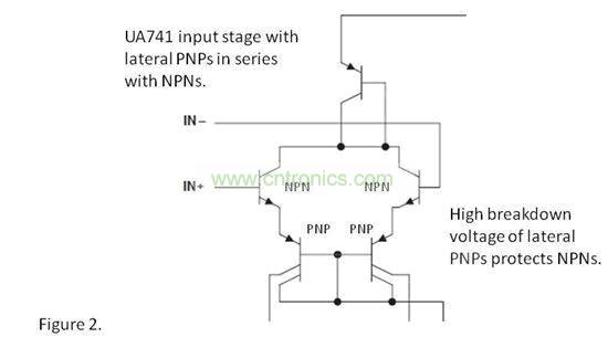 一般而言,雙極NPN 晶體管運算放大器都有輸入鉗位,例如:OP07、OPA227 和OPA277 等。uA741 是一個例外,它具有NPN 輸入晶體管,并且有一些為NPN 提供固有保護的附加串聯(lián)橫向PNP。