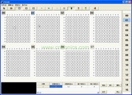 在此界面中,可以同時觀測到16*32個通道的LED照明或背光產(chǎn)品的老化。總共分為16組, 每組可達32個通道, 并用數(shù)組表示。界面上每個方塊代表一個通道,當(dāng)該通道配置時,該通道方塊呈灰色。用顏色來區(qū)分不同的運行狀態(tài),能使用戶在使用過程中更加清晰、簡便、快速的觀測到任何細微的變化。通常來說,為了符合人們的習(xí)慣,不同顏色所表示的功能如下: