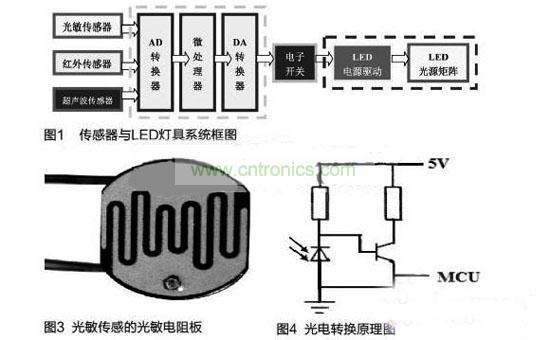 傳感器作為信號采集和機電轉換的器件,其機電技術已相當成熟,近幾年MEMS(微機電系統(tǒng))技術興起又將傳感器技術向小型化、智能化、多功能化、低成本化大踏步邁進。光敏傳感器、紅外傳感器等各種類型的傳感器都可與LED照明燈具組成一個智能控制系統(tǒng),傳感器將采集來的各種物理量信號轉換成電信號,可以經由集成電路化的AD(模數(shù))轉換器 、MCU(微控制器)、DA(數(shù)模)轉換器對所采集的信號進行智能化處理,從而控制LED照明燈具開啟和關閉。人類可以籍此在MCU上設定各種控制要求,控制LED燈的開關時間、亮度、顯色、多彩變幻,從而達到省電節(jié)能的目標。傳感器與LED燈具組成的系統(tǒng)框圖如圖1所示。目前的集成電路制造技術已經可以將AD、DA、MCU集成在一個5mm×5mm或更小的封裝內,安裝在燈具內既不占面積而且十分方便。