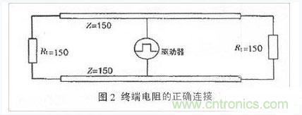 ②阻抗不連續(xù),顧名思義,與光從一種媒質(zhì)進(jìn)入另一種媒質(zhì)時(shí)所引起的反射是相似的。信號(hào)在傳輸線末端突然遇到電纜阻抗很小甚至沒(méi)有,信號(hào)在這個(gè)地方就會(huì)引起反射。消除這種反射最常用的方法,是在電纜的末端跨接一個(gè)與電纜的特性阻抗同樣大小的終端電阻,使電纜的阻抗連續(xù)。由于信號(hào)在電纜上的傳輸是雙向的,因此,在通訊電纜的另一端同樣要跨接一個(gè)相同大小的終端電阻,如圖2所示。
