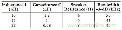 常見的濾波器設(shè)計(jì)選擇目的是為了在所需要的最高音頻頻率條件下將濾波器響應(yīng)下降減至最小以獲得最低帶寬。如果對于高達(dá)20 kHz頻率,要求下降小于1 dB,則要求典型的濾波器具有40 kHz巴特沃斯(Butterworth)響應(yīng)(以達(dá)到最大平坦通帶)。對于常見的揚(yáng)聲器阻抗以及標(biāo)準(zhǔn)的L值和C值,下表給出了標(biāo)稱元器件值及其相應(yīng)的近似Butterworth響應(yīng):