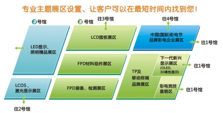 作為光電顯示行業(yè)的標志性活動,深圳光電顯示周暨中國(國際)彩電節(jié)將一如既往地覆蓋光電顯示全產業(yè)鏈,設立LCD面板展區(qū)、FPD材料組件展區(qū)、FPD裝備及檢測展區(qū)、彩電節(jié)品牌展區(qū)、彩電競技直銷展區(qū)、TP及移動終端品牌展區(qū)、下一代顯示展區(qū)等7大專區(qū),主要展示液晶顯示、OLED、觸控、TV、3D等上中下游產業(yè)鏈最新技術與最新產品等。