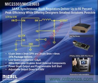 麥瑞半導(dǎo)體推出了采用HyperLight(R)Load技術(shù)的4MHz PWM 6A/3A同步降壓穩(wěn)壓器系列產(chǎn)品MIC23603/303。MIC23603/303采用的專利架構(gòu)提供了最高水準(zhǔn)的瞬態(tài)性能,在全脈寬調(diào)制(PWM)模式下輸出紋波僅有5mV。MIC23603/303將低損耗的專利功率MOSFET與麥瑞半導(dǎo)體擁有專利的恒定導(dǎo)通時(shí)間直流-直流開關(guān)轉(zhuǎn)換器方案結(jié)合在一起,可提供高達(dá)6A/3A的輸出電流,同時(shí)僅消耗24μA靜態(tài)電流。MIC23603/303是驅(qū)動(dòng)機(jī)頂盒、便攜式設(shè)備以及汽車儀表中的FPGA、ASIC和DSP集成電路的理想產(chǎn)品,在這些應(yīng)用中,超快瞬態(tài)響應(yīng)和輕載效率至關(guān)重要。MIC23603目前已經(jīng)開始批量供應(yīng),千片訂量的價(jià)格為1.08美元/片。MIC23603的千片訂量價(jià)格為0.49美元/片。