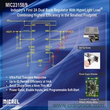 麥瑞半導(dǎo)體推出了兩款3MHz雙輸出2A高效降壓穩(wěn)壓器MIC23158/9。得益于麥瑞半導(dǎo)體擁有專利的HyperLight Load®技術(shù),這兩款集成電路為當(dāng)今最苛刻的應(yīng)用提供了超快的瞬態(tài)響應(yīng),包括機(jī)頂盒、針對(duì)FPGA的核心和I/O電壓、CPLD、ASIC、GPS/導(dǎo)航系統(tǒng)、PC卡、汽車儀表以及通用負(fù)載點(diǎn)(POL)直流-直流轉(zhuǎn)換等應(yīng)用。MIC23158/9目前已經(jīng)開始批量供應(yīng),千片訂量的價(jià)格分別為0.88美元/片和0.91美元/片。