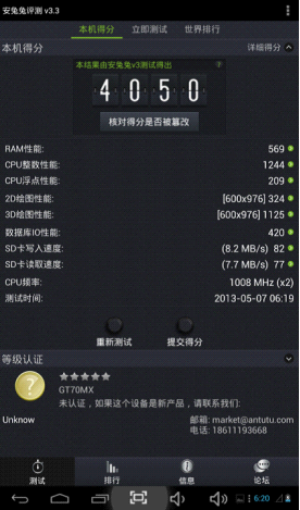 AnTuTu Benchmark是一個(gè)專(zhuān)門(mén)給Android設(shè)備的手機(jī)、平板電腦硬體打分的軟件,,通過(guò)“內(nèi)存性能”、“CPU整數(shù)性能”,“CPU浮點(diǎn)性能”、“2D、3D繪圖性能”、“數(shù)據(jù)庫(kù)IO”、“SD卡讀、寫(xiě)速度” 等性能測(cè)試對(duì)手機(jī)的硬體性能做出評(píng)分。