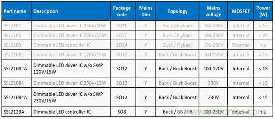 圖2 NXP中小功率市電供電可控硅調(diào)光LED驅(qū)動(dòng)IC選型表格