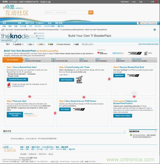 e絡(luò)盟母公司Premier Farnell集團(tuán)首席技術(shù)官沈洪先生表示:“我們很高興能夠在強(qiáng)大的e絡(luò)盟社區(qū)推出這個(gè)行業(yè)首屈一指的網(wǎng)站平臺(tái)。e絡(luò)盟社區(qū)現(xiàn)擁有20萬(wàn)社區(qū)成員,通過(guò)將設(shè)計(jì)工程師、業(yè)余愛好者及供應(yīng)商合作伙伴集中到一個(gè)平臺(tái),以便他們進(jìn)行直接交流,極大地縮短了新品上市時(shí)間。我們極力鼓勵(lì)并支持用戶開發(fā)針對(duì)TI MCU LaunchPad的擴(kuò)展板。我們將幫助他們進(jìn)行概念設(shè)計(jì)、產(chǎn)品開發(fā)、原型設(shè)計(jì),直至最后投入市場(chǎng)。”