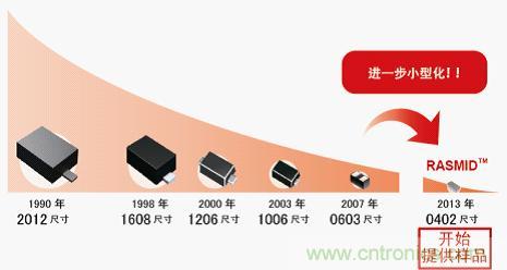 【導(dǎo)讀】ROHM采用全新工藝方法,開(kāi)發(fā)出超越微細(xì)化界限的世界最小元器件“RASMID™系列”,有助于移動(dòng)設(shè)備進(jìn)一步小型化。本文從ROHM的RASMID™系列的特點(diǎn)、二極管的小型化歷史等方面進(jìn)行介紹。