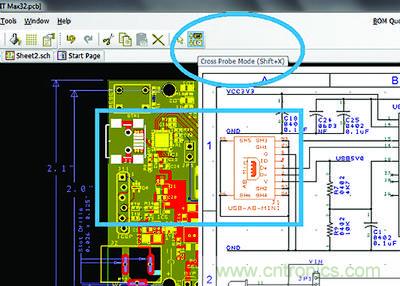 6.0版本中的交叉探測(X-probe)功能能夠在軟件內實現(xiàn)原理圖與PCB設計視圖之間的即時引用,從而進一步加快設計過程。通常情況下在PCB視圖中元件的識別是比較直觀、容易的,但在原理圖中找到該元件的對應符號卻不那么容易,除非用戶對整個系統(tǒng)都了如指掌。通過交叉探測功能,用戶只需在任一視圖中點擊某個元件,即可迅速跳轉到對應視圖中的同一元件。該功能可從PCB視圖跳轉到原理圖,反之亦然。